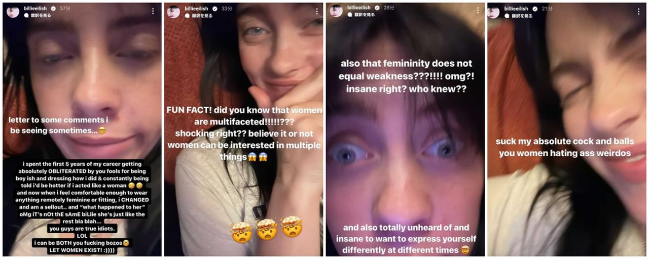 「Bad Guy(バッド・ガイ)」や「When the Party’s Over(ホエン・ザ・パーティーズ・オーヴァー)」などのヒット曲で知られるシンガーのビリー・アイリッシュが、ここ数年で変化した自身のファッションについてあれこれ言ってくる“アンチ”に向けたメッセージを、インスタグラムのストーリーにアップした。