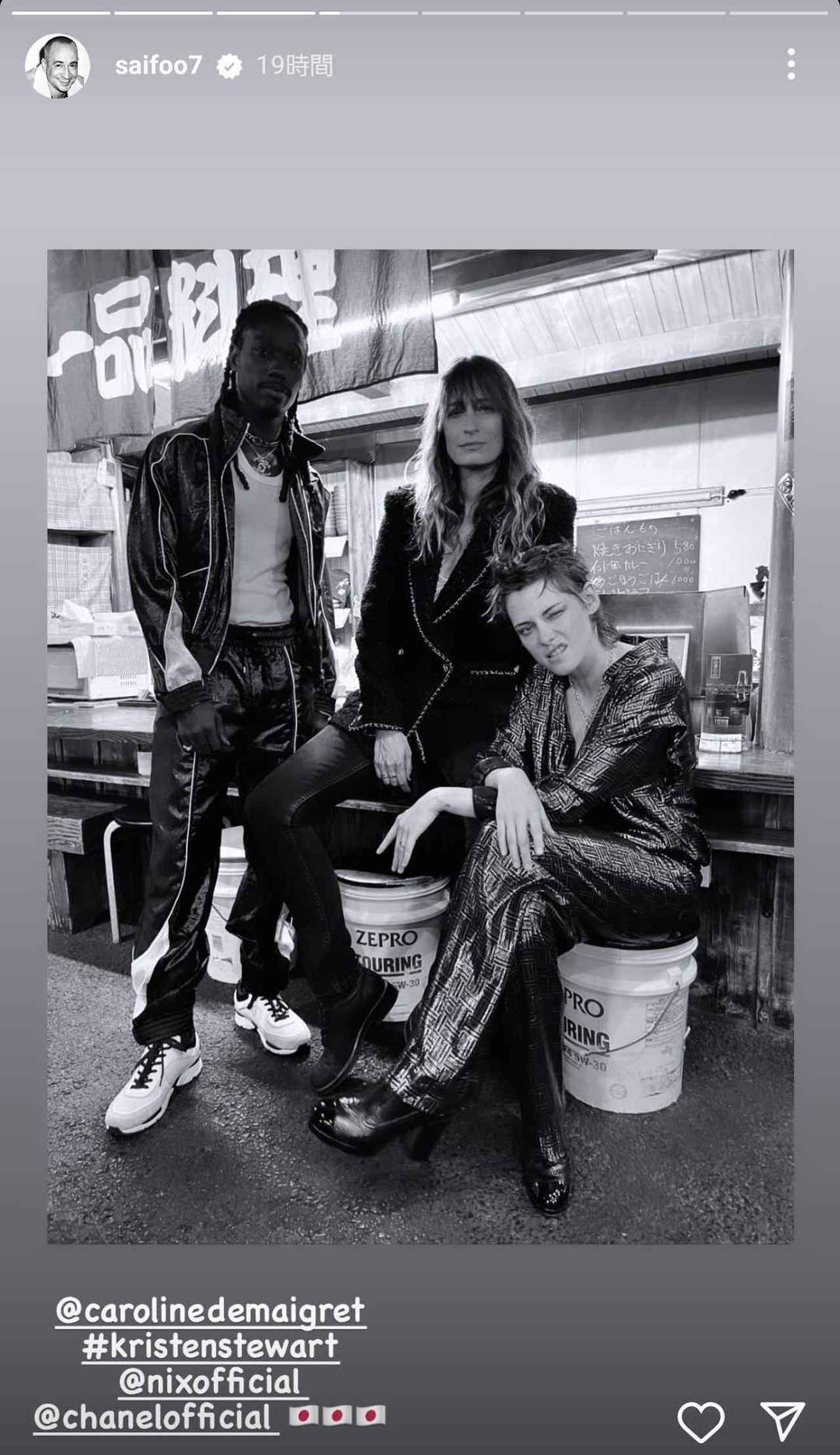 ショーの前日には早速日本で取材。シャネルのミューズとして知られるモデルのカロリーヌ・ド・メグレと撮影を行なっており、シューティングのために日本の居酒屋へ。居酒屋でペール缶に座っているだけでも絵になるのはさすが。