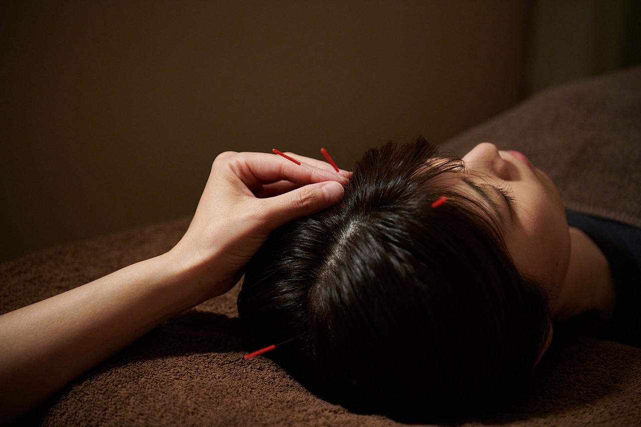 施術が始まると、まずは呼吸を整える練習。息を深く吸って深く吐くのを繰り返し、その後本格的な施術へ。約1時間かけて、頭まわりやデコルテ、首、肩回り、背中などを、鍼、灸、マッサージでほぐしていく。