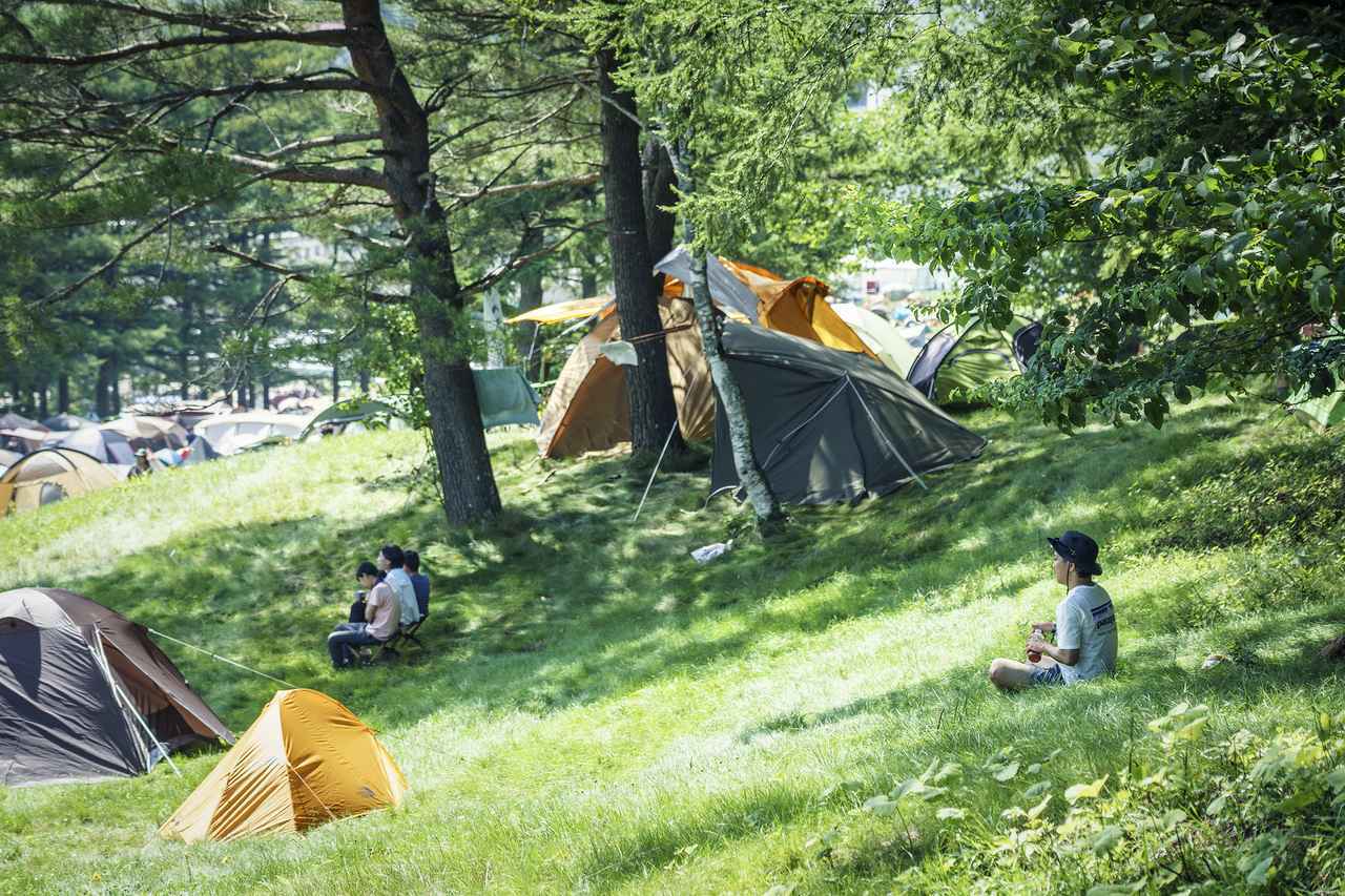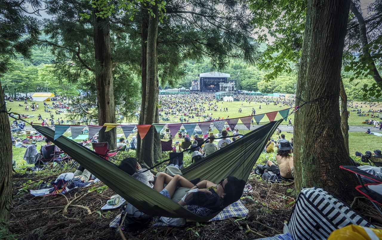フジロックでは、ステージが目を奪われる豊かな緑の中に点在し、会場内を流れる清らかな川のせせらぎや葉のそよぎが音楽と調和する。標高1000mの山の中で、都会の喧騒だけでなく湿度の高い日本の夏から解放される夏キャンプは現代における贅沢。