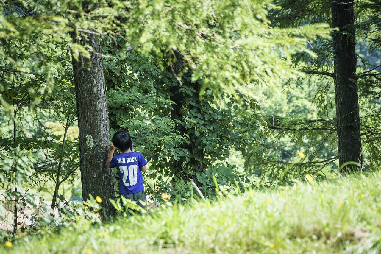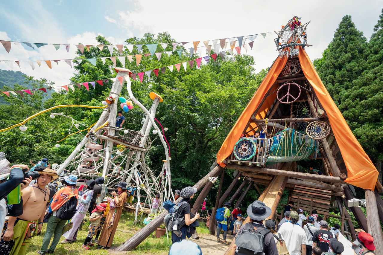 中学生以下入場無料のフジロックはファミリーも多数。家族連れにとってキッズランドは必須。メリーゴーランドのほか、スタッフが趣向を凝らした遊具やアート制作エリア、焚火エリアなどがあるアミューズメントエリアは、まさに森の秘密基地! 森のプレイパークではあそび歌や読み聞かせがあり、こどもフジロッカーに大人気。