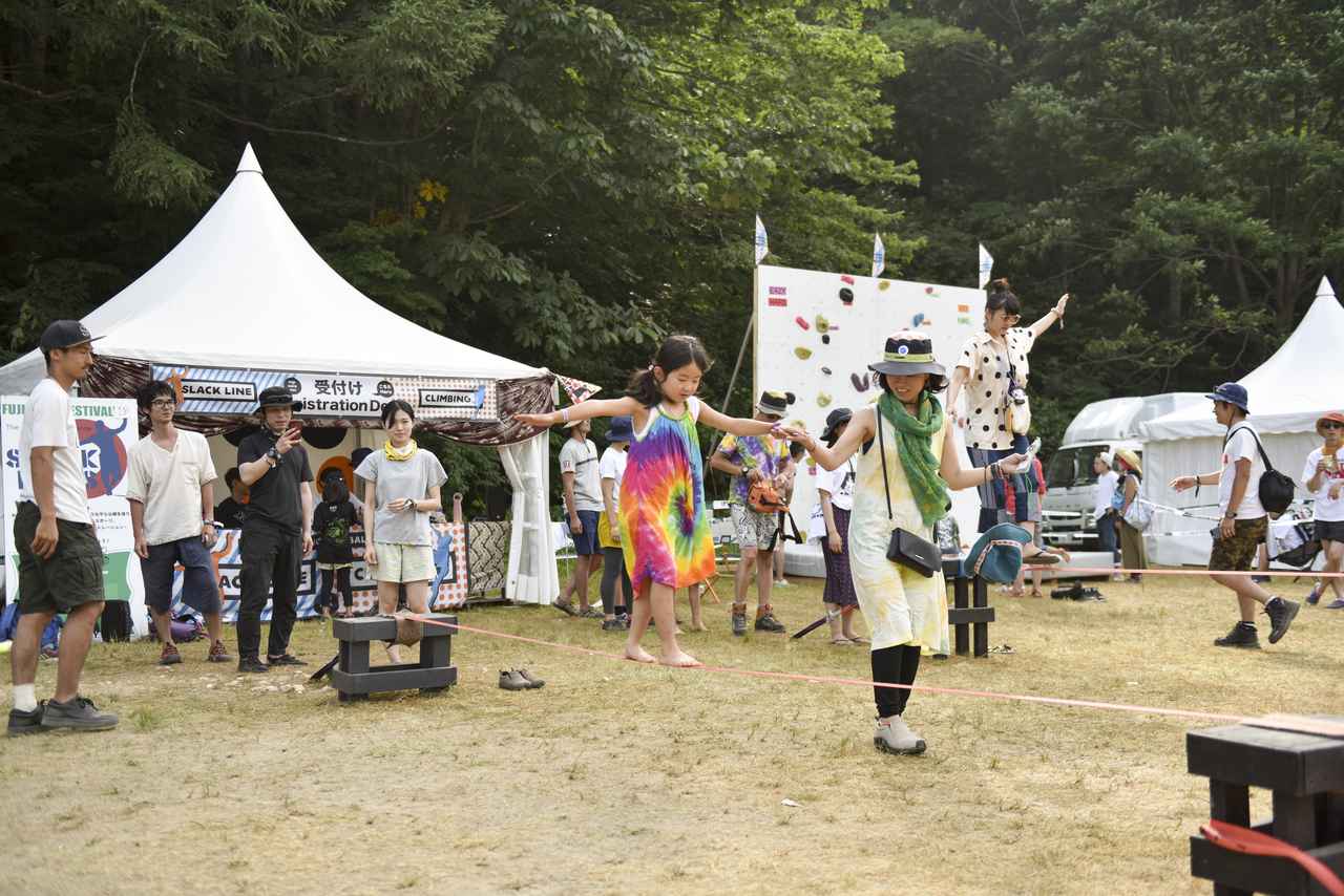 フジロックは大人が楽しめる非音楽イベントも多数。2023年のアクティビティは今後発表される予定だが、過去のイベントでは、スラックライン体験、大道芸、ボルダリング、青空寄席、ワークショップ、エッグハントなど、多様な催しが退場者を楽しませた。