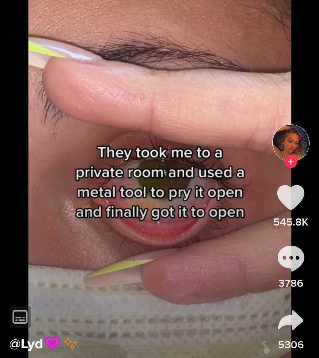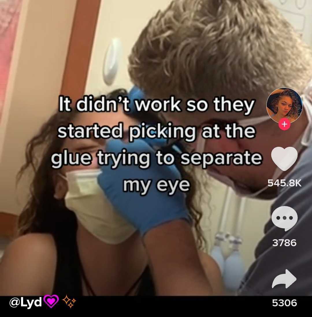 まず病院につくと、接着剤を溶かすために軟膏を塗られたよう。しかし「うまくいかなかったので、彼らは私の上まぶたと下まぶたを離そうと接着剤をつつきながら取り始めました」と、実際に医師がリドの目を触っている様子を共有。