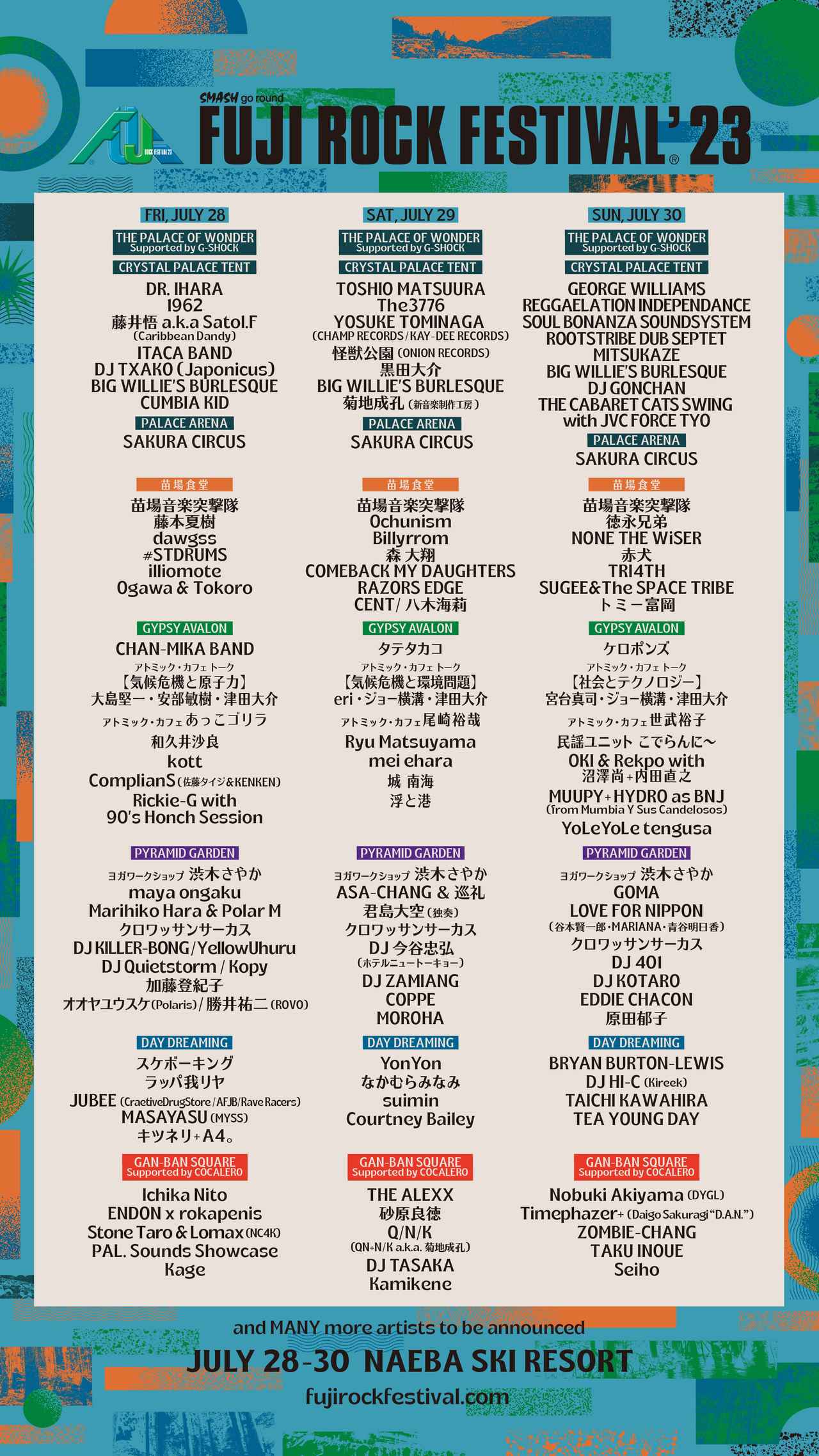 フジロック・フェスティバル’23のラインナップ第7弾が発表に。Gypsy Avalon、PYRAMID GARDEN、DAY DREAMING、GAN-BAN SQUAREという、フジロックに欠かせない4つのステージの出演者が一挙に明らかになった。(フロントロウ編集部)