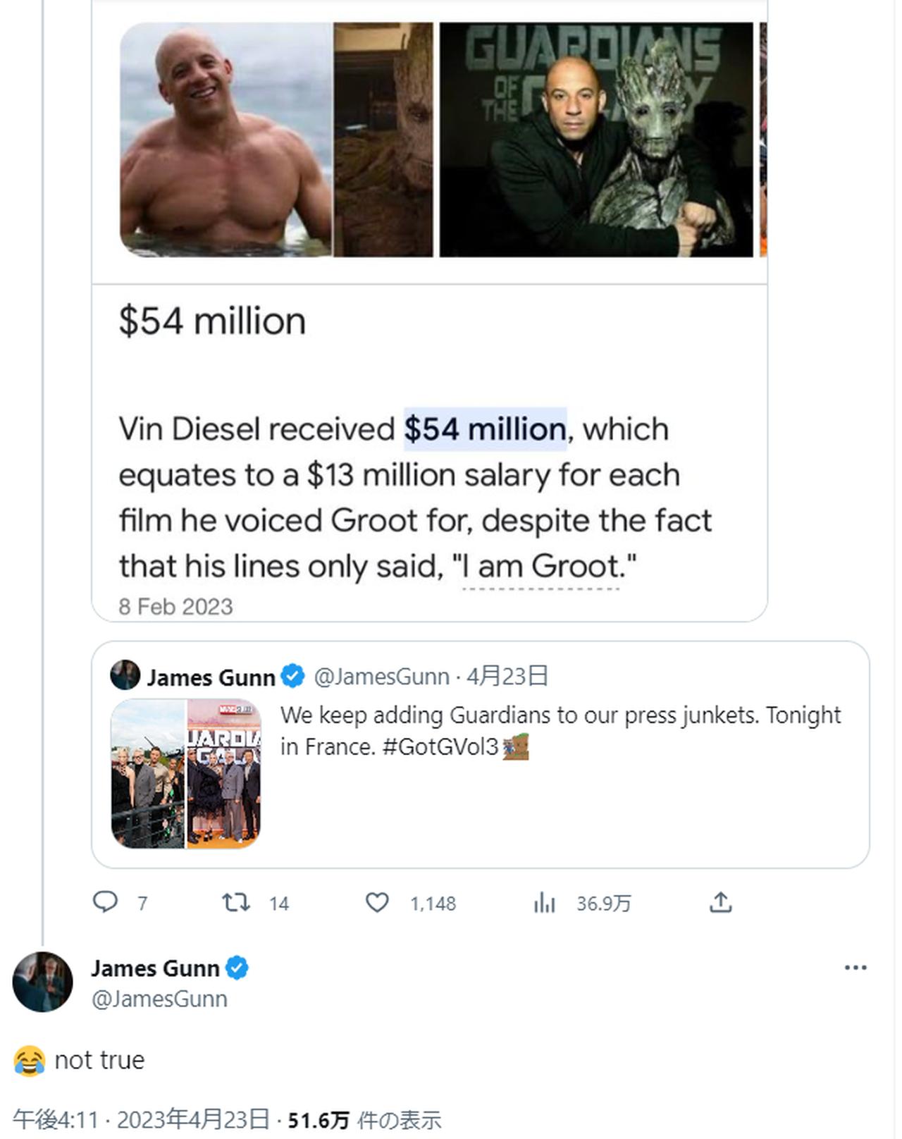 ただこちらについては、シリーズの監督を務めるジェームズ・ガンがツイッターで爆笑する絵文字つきで「事実ではありませんよ」と否定。実際にいくらのギャラをもらっているかは明かさなかったが、泣き笑いするほどおかしな情報ということのようなので、18億円からは大幅に低い額なのではないだろうか。