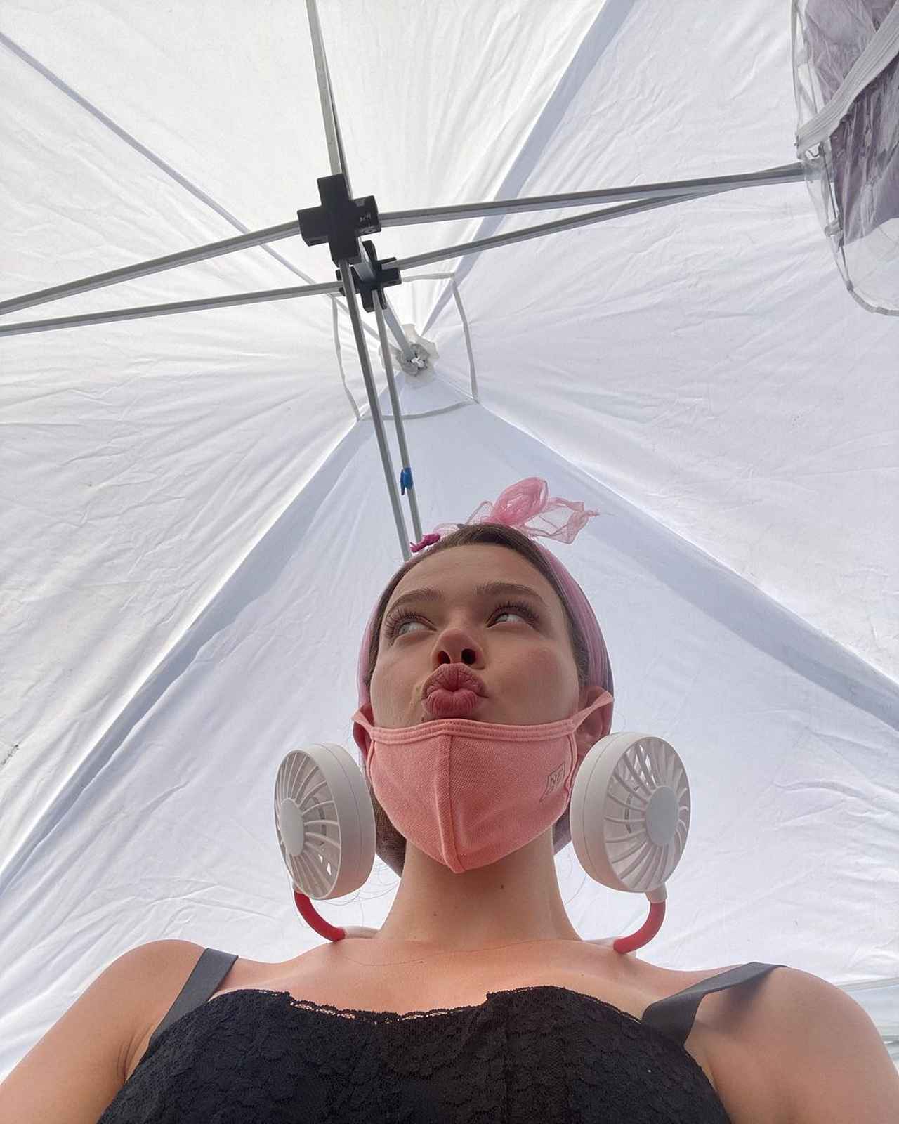 自分の衣装を並べた写真や、衣装を着用した写真はもちろん、コロナ禍に撮影されたこともあり撮影以外はマスクをしていた様子や、ハリーやスタッフらと撮影の合間にランチを楽しむ姿などの裏側を公開した。