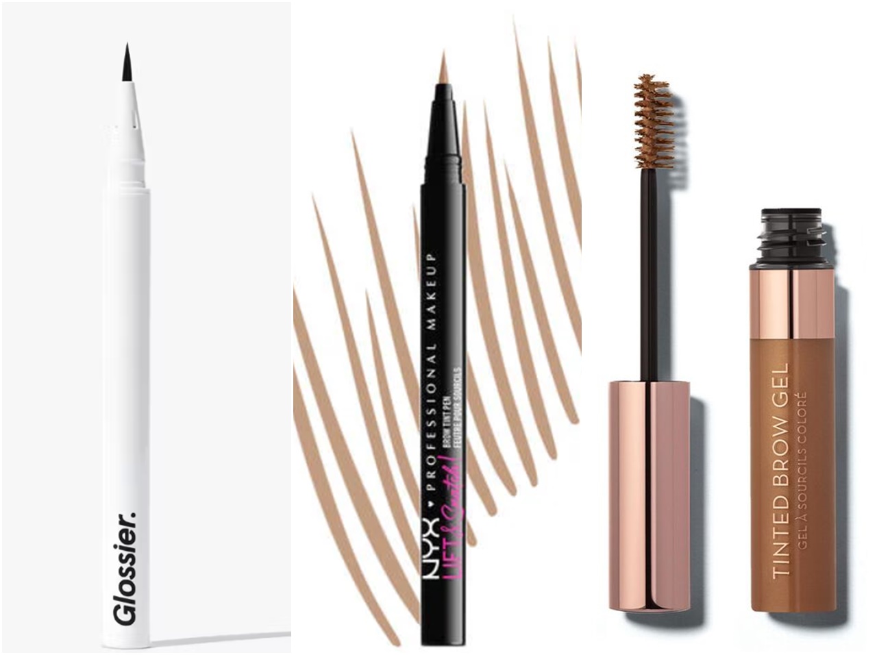 使われたのは、Glossierのアイブロウペン「Brow Flick」、NYXのアイブロウペン「LIFT & SNATCH! BROW TINT PEN」、Anastasia Beverly Hillsの眉マスカラ「Tinted Brow Gel」の3つ。