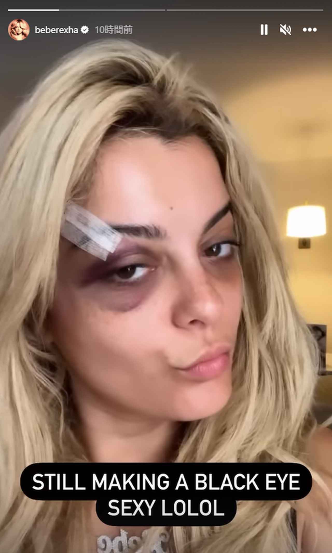 3針縫う大けがだったという報道もあったが、その後、ビービーがSNSを更新。ビービーはインスタグラムの投稿で「私は大丈夫だよ」とファンを安心させたが、1枚目の写真では目が殴られたあとのように青くなっており、2枚目の写真では眉毛付近が大きく切れているのが分かる。さらにストーリーズでは、「青あざもセクシーに見せてやる」とおどけてみせたが、あざの大きさからも相当の衝撃だったことが伺える。