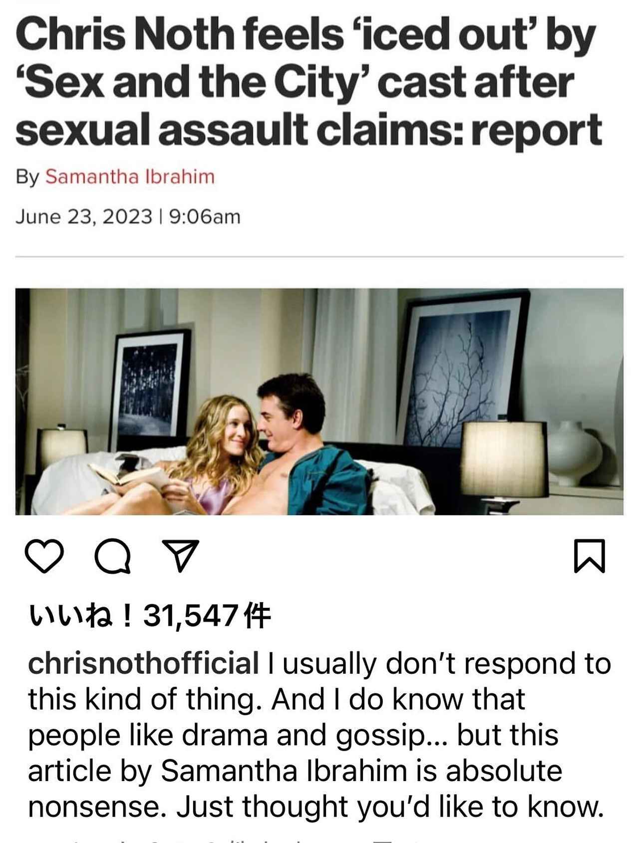 2023年6月23日に待望のシーズン2である『AND JUST LIKE THAT… シーズン2 / セックス・アンド・ザ・シティ新章』の日米同時配信が始まったなか、同日、『性的暴行疑惑のあと、クリス・ノースは『SATC』出演者に無視されていると感じている』というタイトルの記事がNew York Postに掲載された。