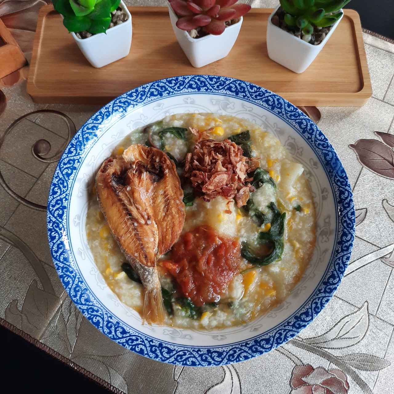 ブブール・マナドは、おかゆにとうもろこし、魚の燻製、エシャロット、チリ、油揚げなどが入っているマナドの郷土料理。