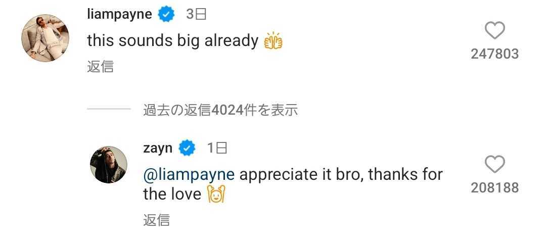 この時ゼインはリアムの発言をスルーしており、2人に交流はないと思われていたが、今回ゼインが新曲の予告をインスタグラムに投稿すると、リアムが「すでに凄いことになりそうな予感がするサウンドだ」とコメント。しかもこれはリアムの一方的なコメントだけでは終わらず、なんとゼインも返答。「感謝するよ兄弟、愛をありがとう」と返信してファンは2人のやり取りに大盛り上がりした。