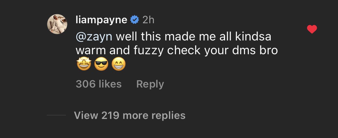 リアムはまさかゼインから返信が来ると思っていなかったのか「心をじわっと温かくなったよ。DMをチェックしてみてくれ」と返信し、ゼインに個人的にメッセージも送ったことを明かした。