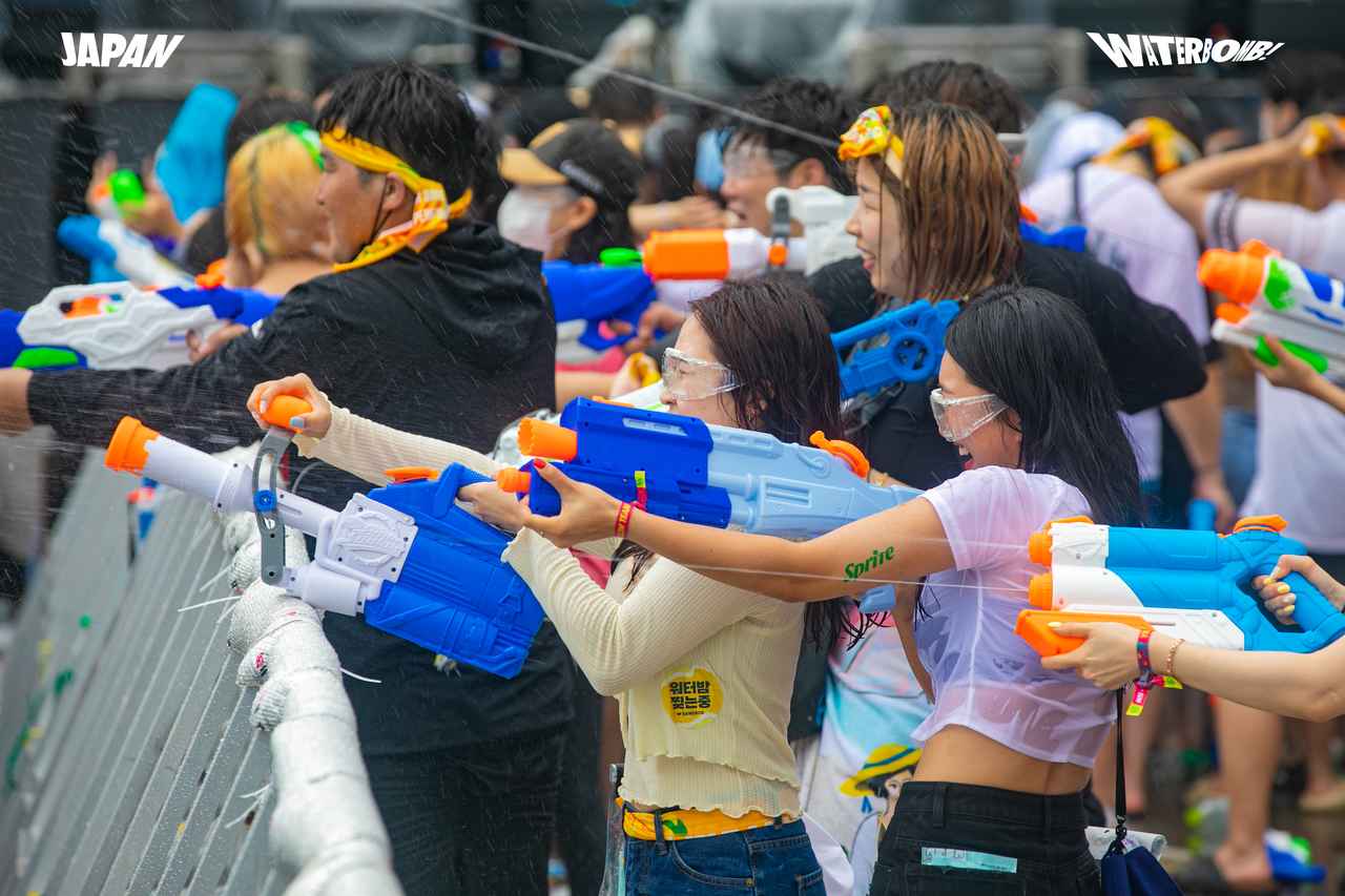 WATERBOMB JAPANでの水の量はレベル違い。チケット購入時に選んだチームごとにわかれて行なう水鉄砲バトル「ウォーターファイティング」に加えて、ステージに設置された強力なウォーターキャノンからは大量の水が観客に発射される。さらにパフォーマーたちも水鉄砲で観客を狙い、夏の暑さをスカッと吹き飛ばす。
