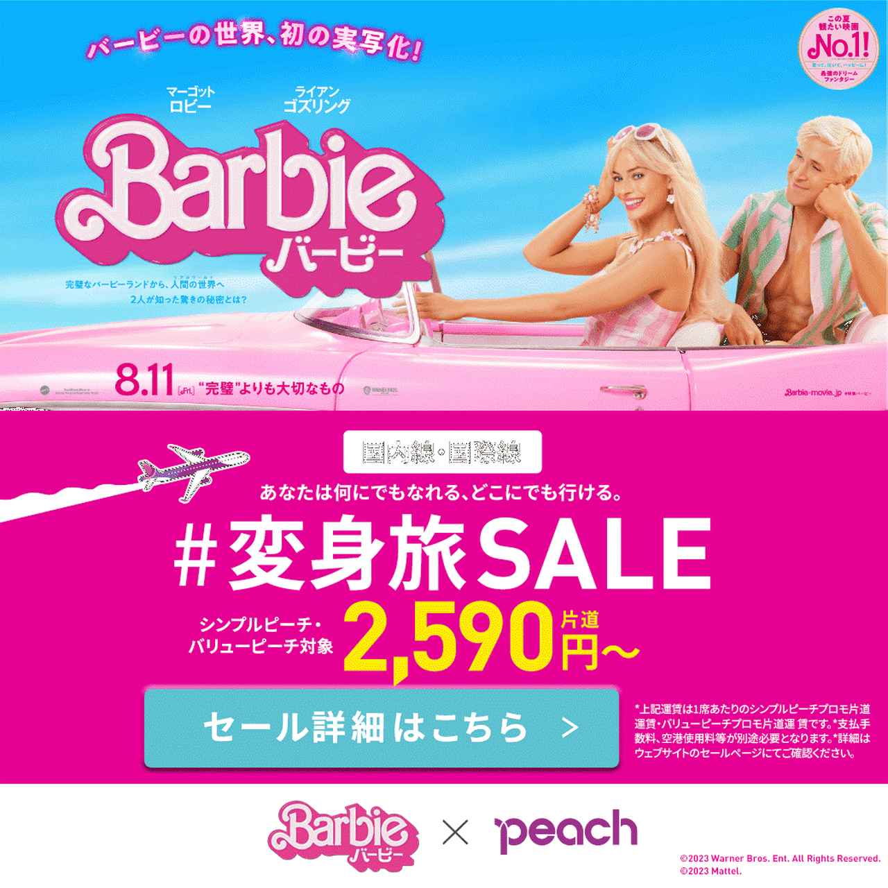 7月7日(金)からは、機体のドア横に映画「バービー」のステッカーが貼られた映画「バービー号」が就航! そして、映画『バービー』×「Peach」のコラボレーションを記念して、国内線25路線、国際線10路線対象の、お得なセール「#変身旅セール」も実施される。