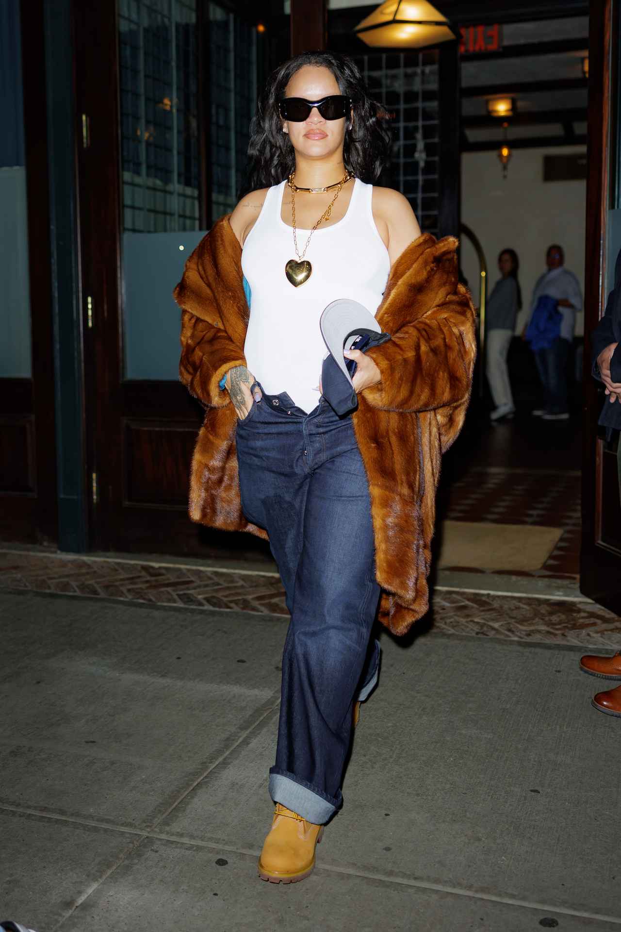4月にニューヨークにて。デニムのボタンを開けて履くのは、リアーナのマタニティファッションの定番。