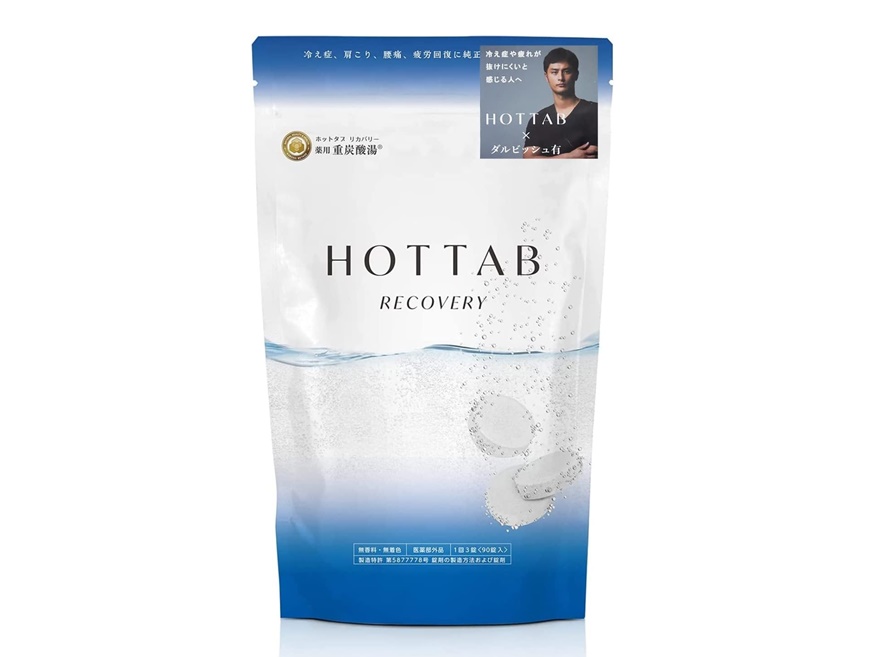 HOT TAB(ホットタブ)の「リカバリー」は、グリシン・アルギニンを追加し疲労回復に特化したホットタブ史上最高濃度の重炭酸入浴剤。重炭酸が溶け込んだホットタブのお湯に15分以上浸かることで、体の芯まで温まる温浴効果を発揮。激しい運動習慣がある人やハードワークで疲れぎみの人にオススメ。