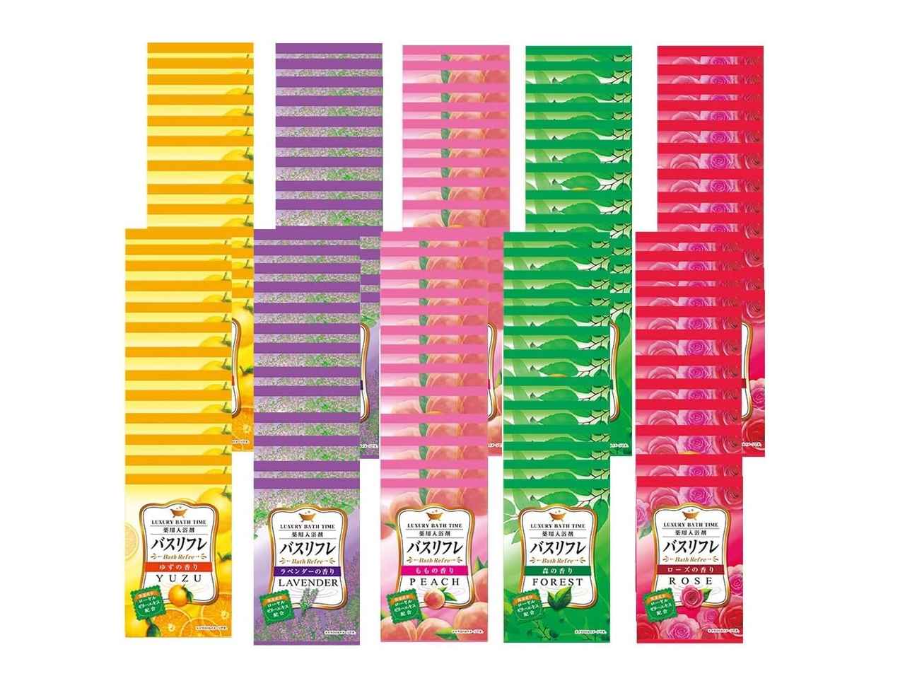 120袋セットで大容量の薬用入浴剤。ももの香り、ゆずの香り、森の香り、ローズの香り、ラベンダーの香りの5種類の香りを日替わりで楽しめる。天然保湿成分配合で肌にうるおいを与え、アロマの香りでリラックス。