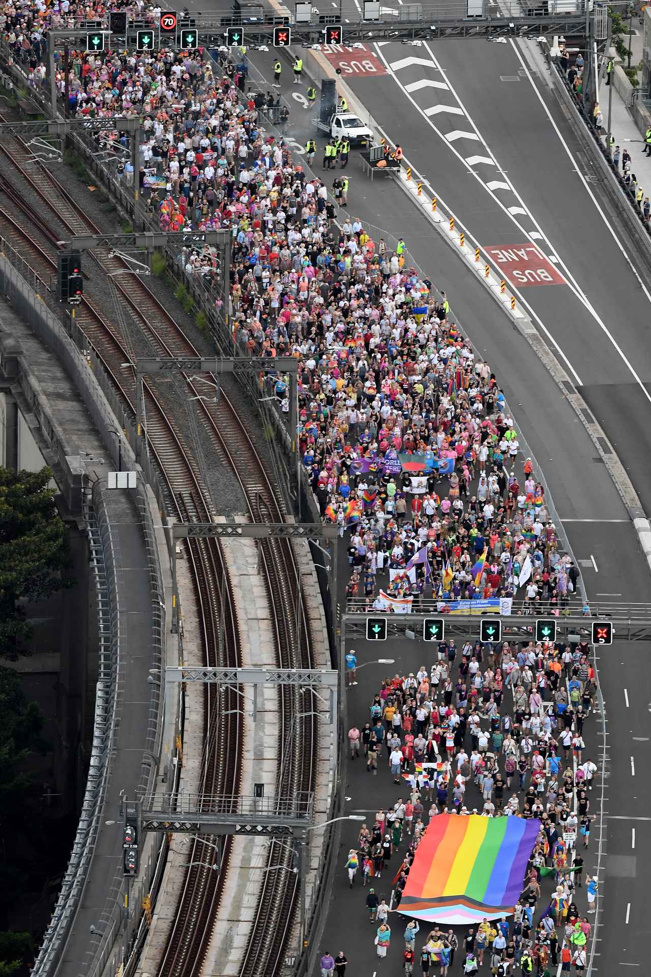 (2023年3月シドニー)LGBTQ+の権利運動において達成してきたことを祝し、まだ達成していないことを認識するためのプライドマーチには5万人が参加した。