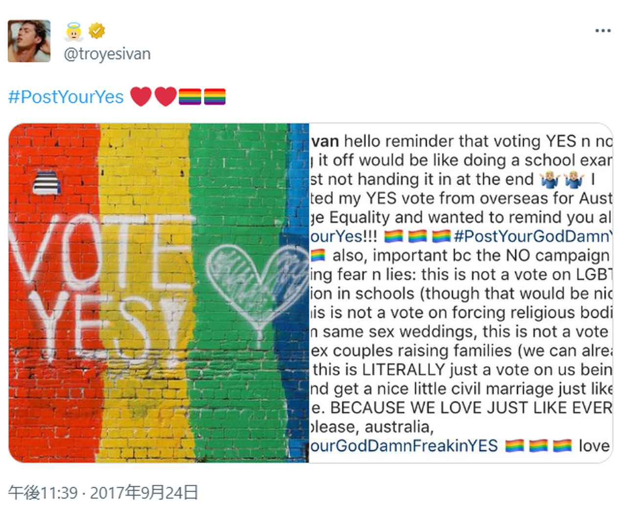 オーストラリア出身の歌手トロイ・シヴァンも#PostYourYesをツイートした。©Troye Sivan/Twitter