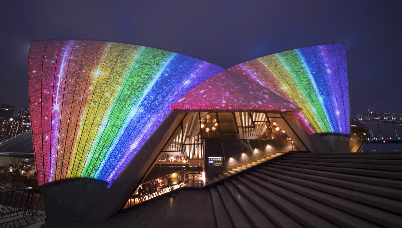 可決当日、結婚の平等の実現を祝してシドニー・オペラハウスは虹色にライトアップ。