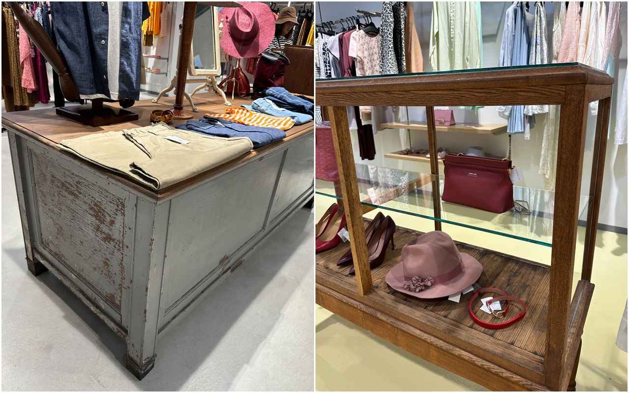 迷路のような空間だけに、何度も行ったり来たりしたくなる「KISARAZU CONCEPT STORE」。そうしているうちに、ふと目につくのがちょっぴりレトロな什器や家具。全体的には近未来風のカラフルな空間に、アンティーク家具や古い什器が盛り込まれている。じつはこれは、サステナブルなこだわりによるもの。