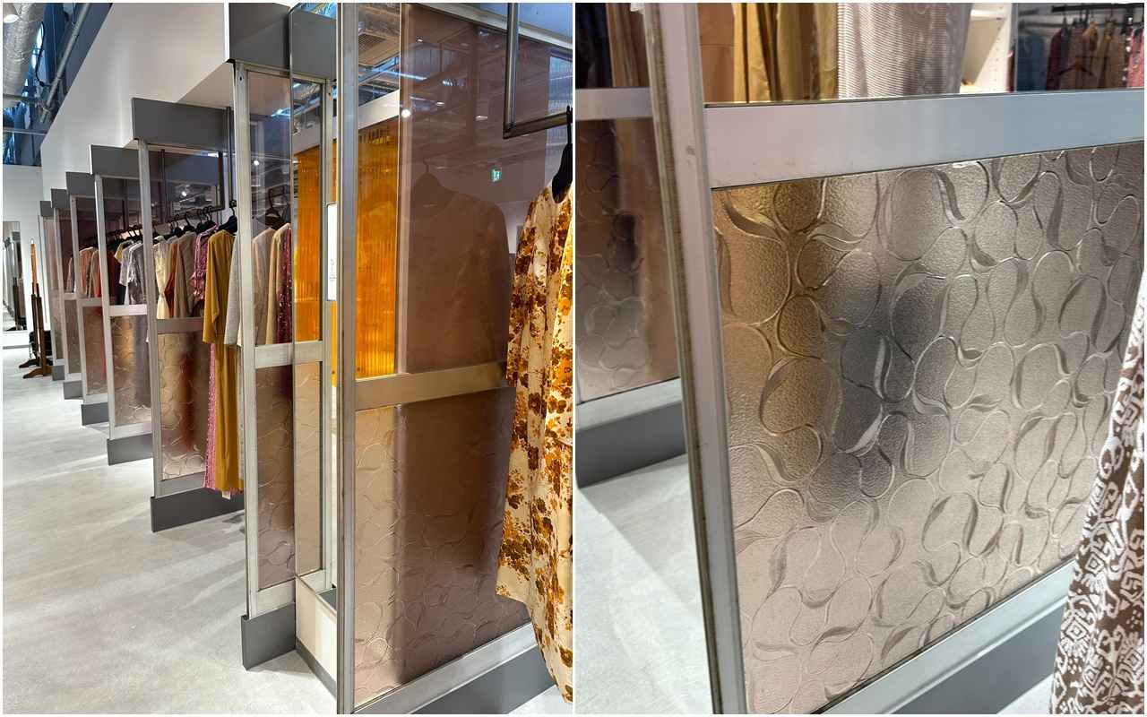 新しい什器だけでなく、過去にPASS THE BATON や三井不動産が管理運営する商業施設に出店している店舗などで使われていたアンティーク家具や古い什器をたくさん再利用。そのほかにも古いガラス戸を区切りとして活用していたり、工場で仕切りとして使用されるビニールカーテンで区切ったコーナーをつくったりと、オシャレなアクセントとして活用。