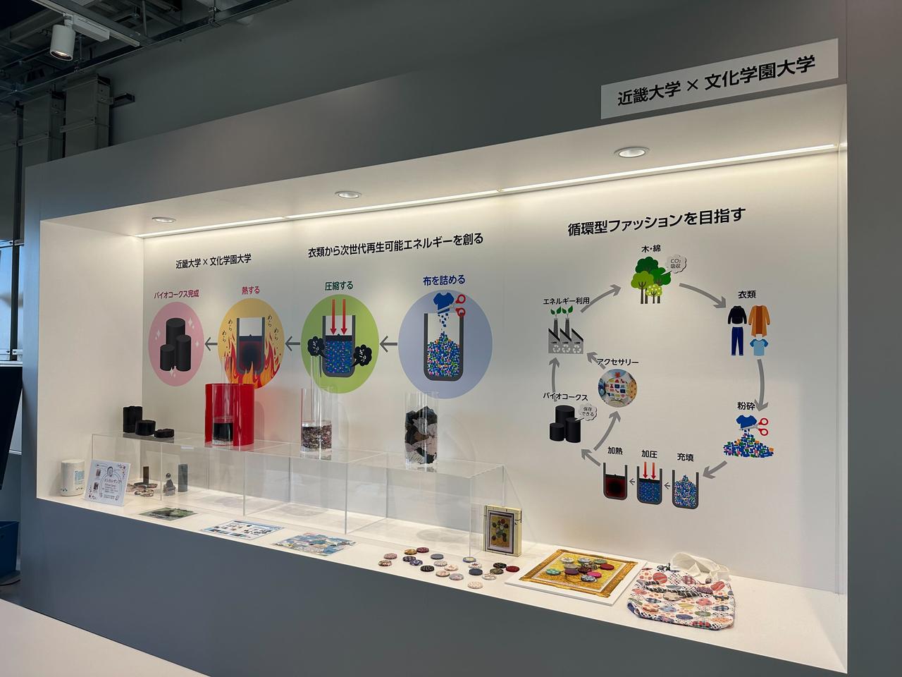 文化学園大学と近畿大学の共同ブースでは、なんと衣類から次世代再生可能エネルギーをつくり出す画期的な研究を公開、展示。廃棄される端切れや仮縫い等の残布、古着を活用した燃料「エシカルザンプ®」の製造プロセスの体験も不定期開催されるそう。