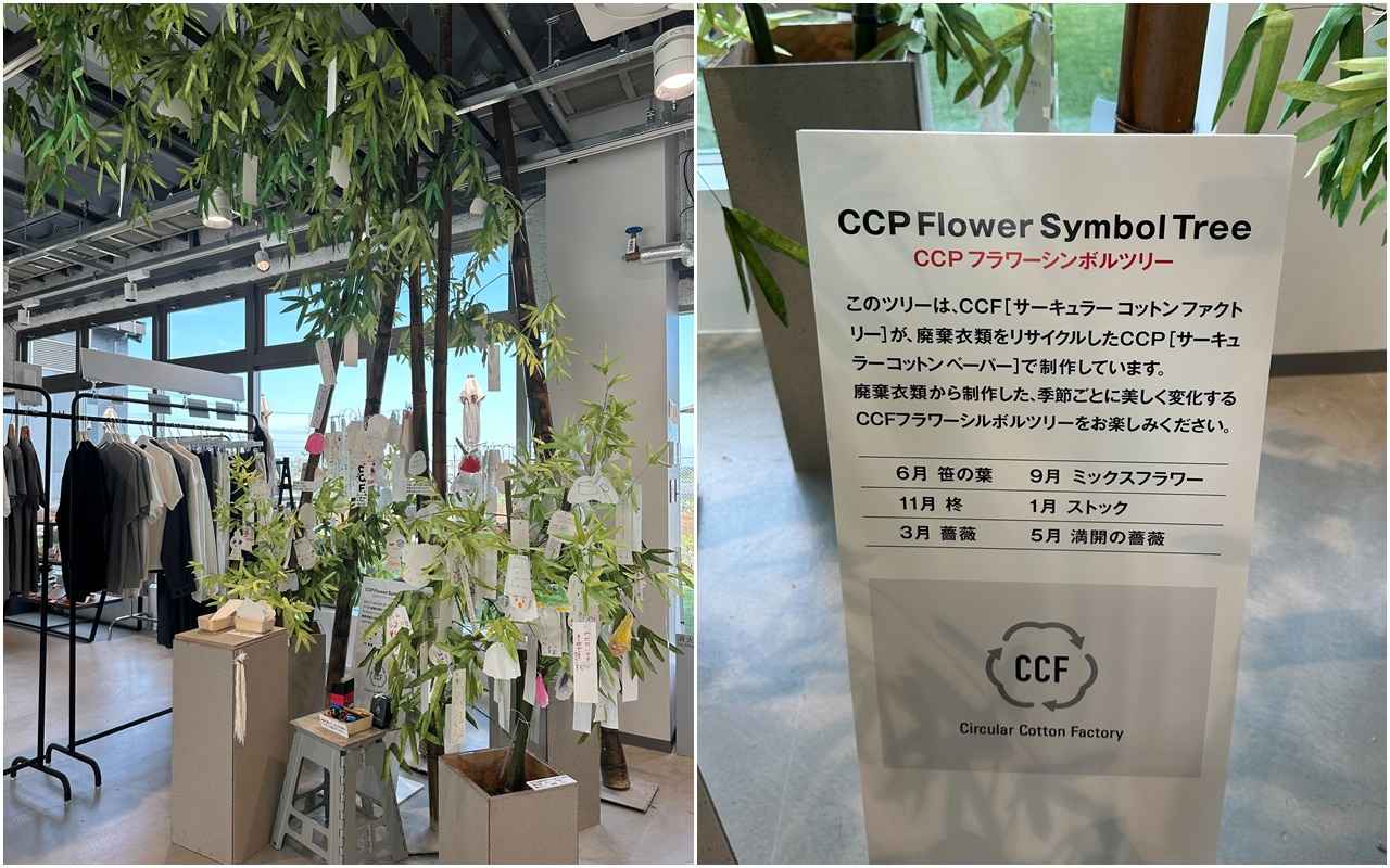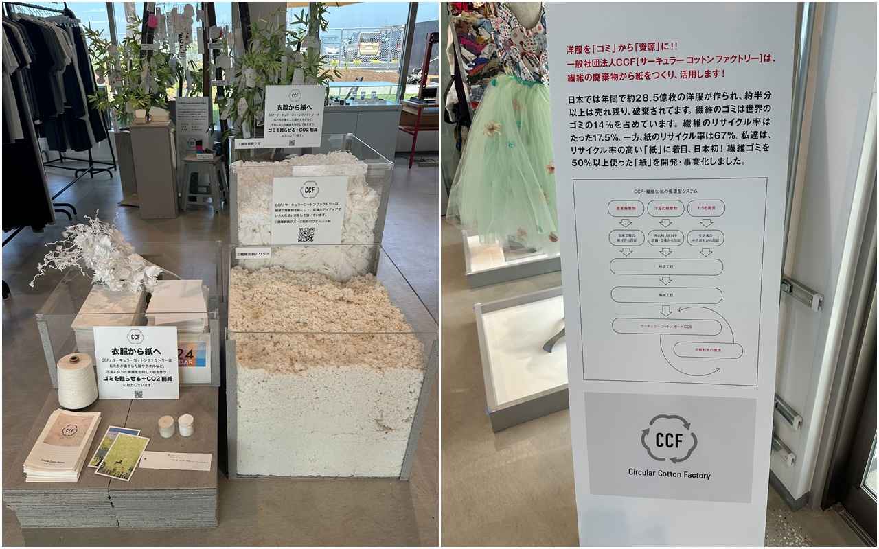 また繊維の廃棄物から紙を作り、循環型社会を目指すプロジェクト「サーキュラー コットン ファクトリー(Circular Cotton Factory、以下CCF)」のコーナーも。繊維から紙をつくる過程を展示しているほか、廃棄衣類をリサイクルして生まれた紙「サーキュラーコットンペーパー」で制作されたシンボルツリーも展示。
