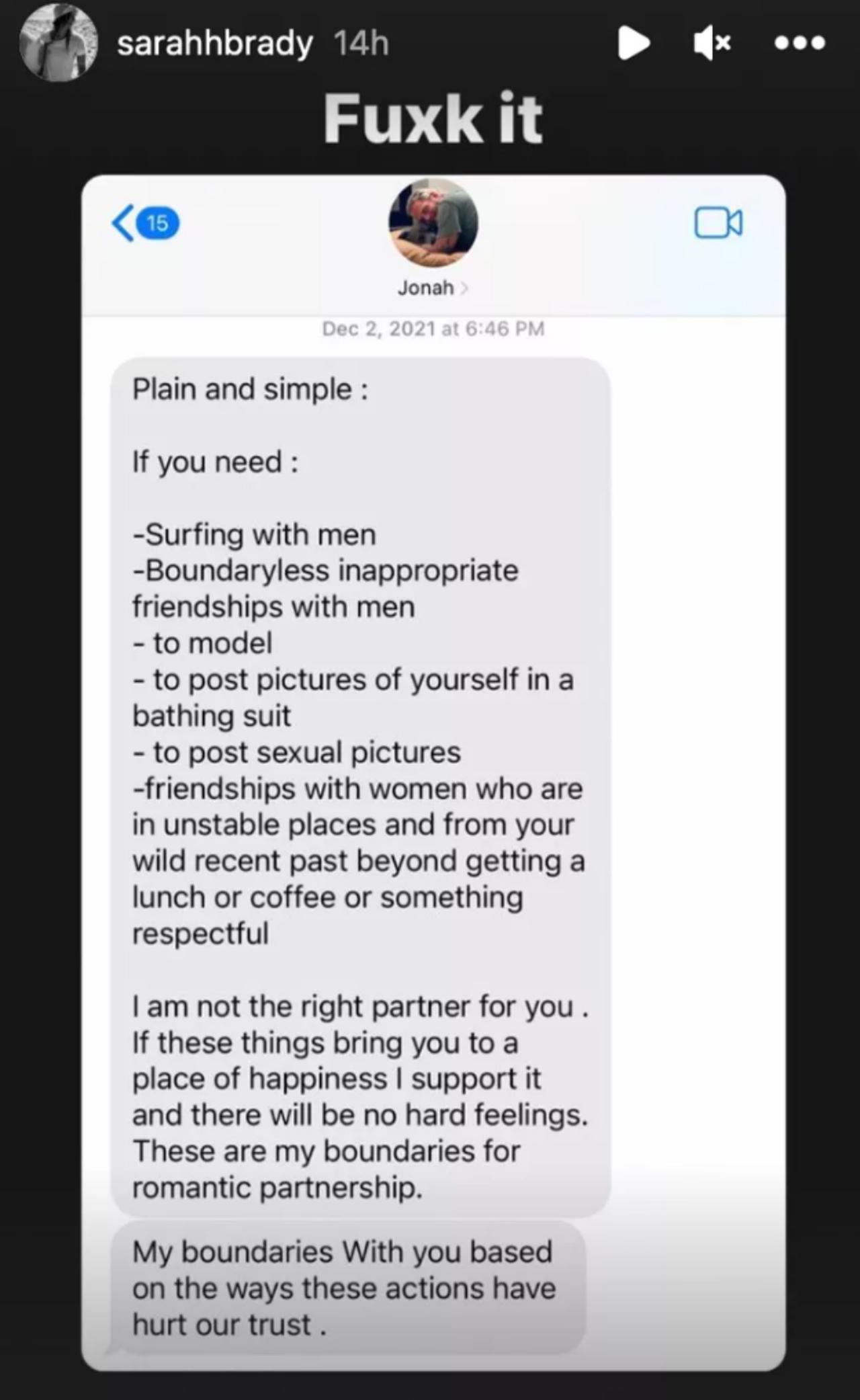 また、別の日にジョナから送られてきたというメールのスクリーンショットには、「もし君が、“男とサーフィンをする”、“男との不適切な友情に境界線を作らない”、“モデルをする”、“水着姿の写真を投稿する”、“性的な写真を投稿する”、“精神的に不安定な状態の女性と友達になる”必要があるなら、僕は君にふさわしいパートナーではない。これらの行動が君を幸せにするなら、僕はそれを支持するし、そのことで君を悪く思ったりはしない。でも、ここに書いたことは僕の恋愛関係における境界線なんだ。これらの行動が僕たちの信頼をどのように傷つけたかにもとづいて、君との境界線を決める」と書かれていた。