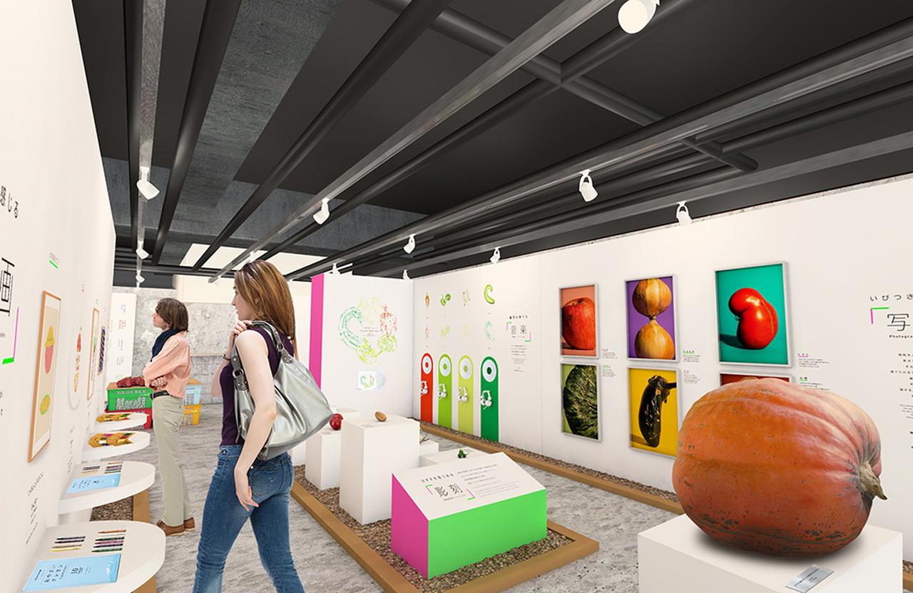 「アートな青果展」は、彫刻、絵画、写真、音楽、物語、言葉の6つの角度から規格外野菜の可能性を切り取り、野菜の価値を見つめ直す体験展示を行なう。