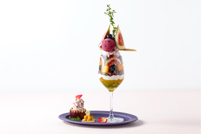 スイーツセラピストのJona氏のユニークな発想で作られた、五感で楽しむオールヴィーガンのパフェとオリジナルティーを楽しんでいると、いつの間にか「ピオニー・フィグ」から「マンゴー・キウイ」に誘われている自分に気づくはず。