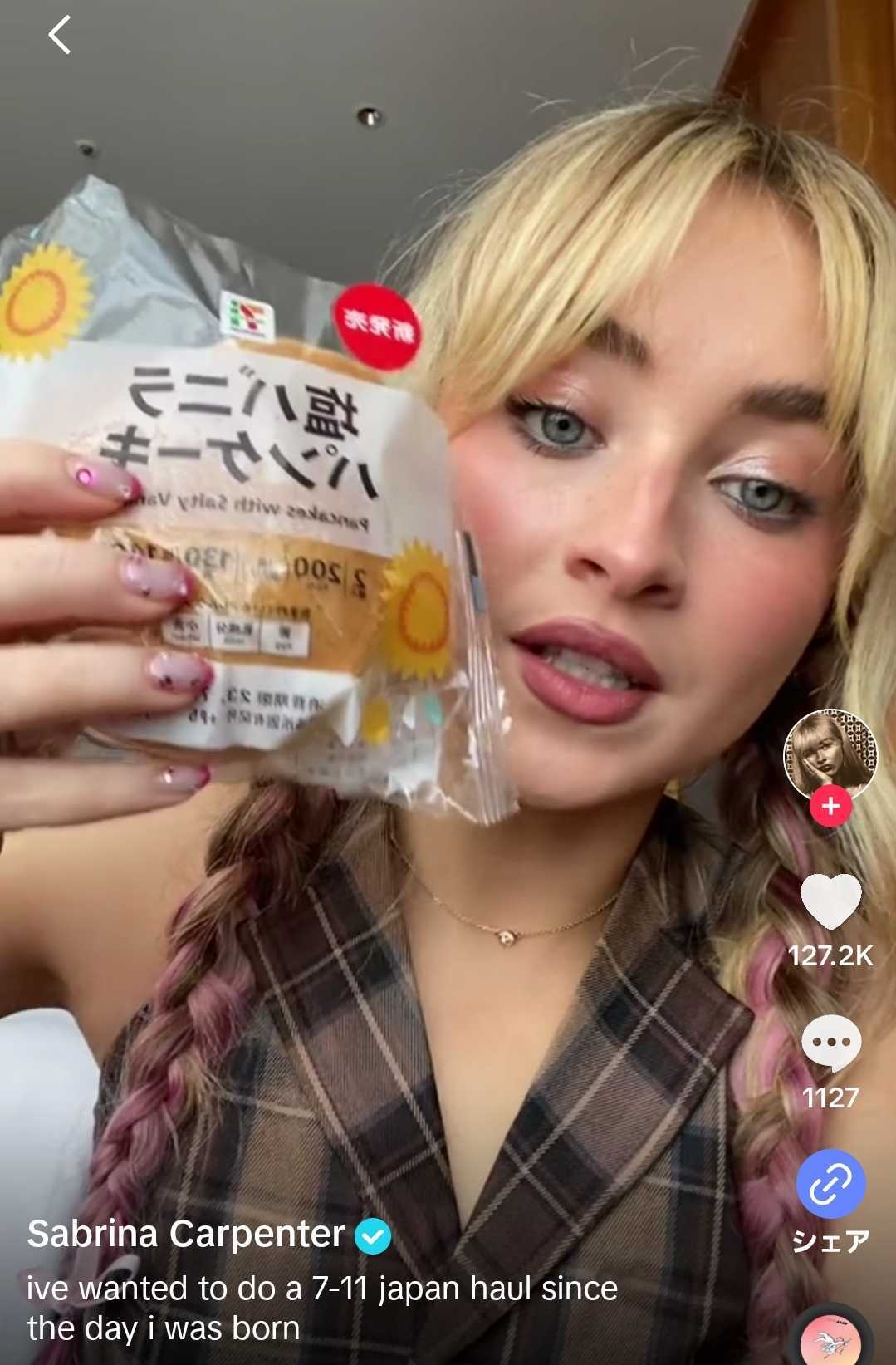 そして2人目は東京と大阪で約4年ぶりの来日公演を行なったサブリナ・カーペンター。サブリナはセブン-イレブンのファンのようで、「生まれたときから、日本のセブン-イレブンのツアーをしたかった」とTikTokに書き込み、紅鮭のおにぎりやフルーツサンド、塩バニラパンケーキ、いちごオレ、ピリ辛つぶせんなどを爆買い。とくに塩バニラパンケーキが気に入ったようで、「これ最高」と評していた。