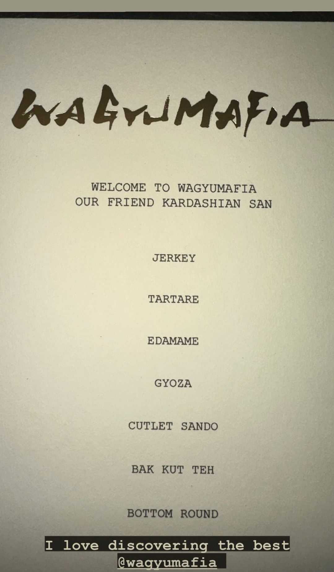 メニューの上部には「Welcome to WAGYU MAFIA Our Friend Kardashian San(私たちの友人であるカーダシアンさん、WAGYU MAFIAへようこそ)」と書かれており、特別なおもてなしにキムもご満悦のようで、「最高の品を見つけるのが大好き」とインスタグラムでWAGYU MAFIAを絶賛。