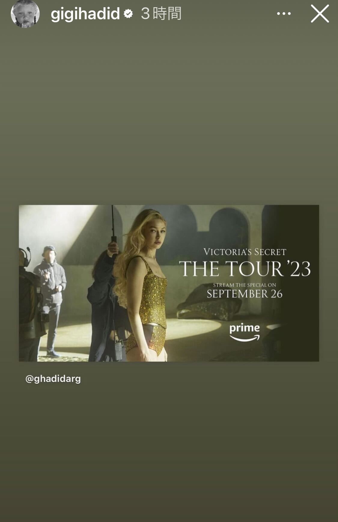 ジジ・ハディッドは、『ヴィクトリアズ・シークレット・ワールド・ツアー』より、自身が映る素材をストーリーズに公開。©Gigi Hadid/Instagram