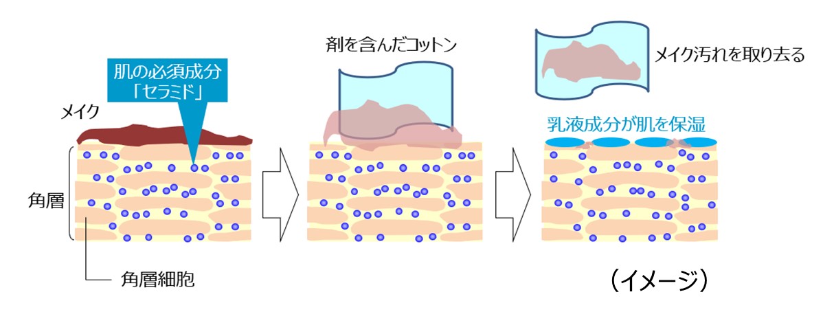 毛穴の約1/1,000サイズのセラミドケア※1オイル※2を配合した乳液が、肌のすみずみまで行き渡り、メイクやちり、花粉などの汚れをオフ。