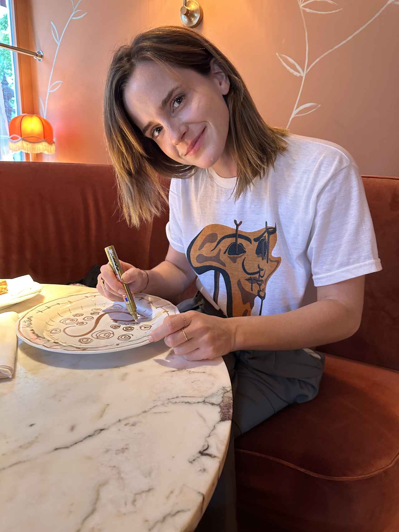 映画『ハリー・ポッター』シリーズのハーマイオニー役や映画『美女と野獣』のベル役で知られるエマ・ワトソンが、フランスのパリにある人気レストラン「Siena Paris」でランチをしたあと、店に贈る記念品としてお皿にサイン&絵を描いているところをキャッチした。