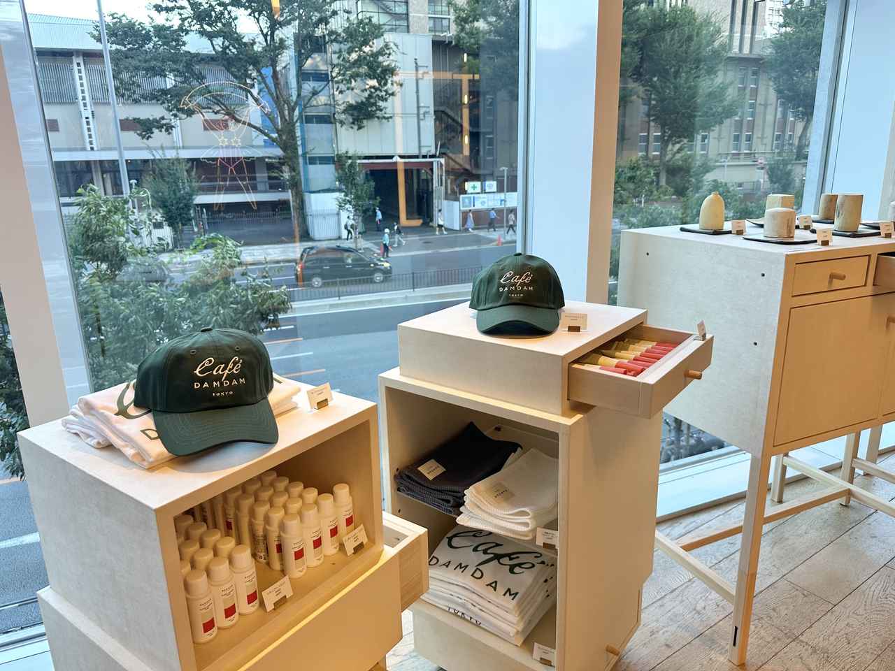 併設されたPOP-UP SHOPでは、製品だけでなくカフェ限定のキャップやTシャツも発見。創設者2人が長くファッション業界に携わってきただけあって、DAMDAM TOKYOならではのオシャレなアイテムが並ぶ。
