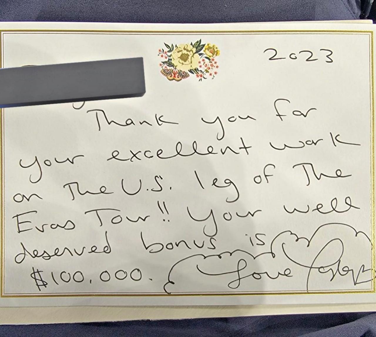 テイラーはいつも頑張ってくれているスタッフたちに大金のボーナスを渡したが、じつはボーナスと共に心温まる手紙も添えられていたことが分かった。テイラーがスタッフに渡した手紙には「ザ・エラズ・ツアーのアメリカツアーで素晴らしい仕事をしてくれてありがとうございます。あなたが受け取って当然なボーナスの額は10万ドルです」と手書きで書かれていた。