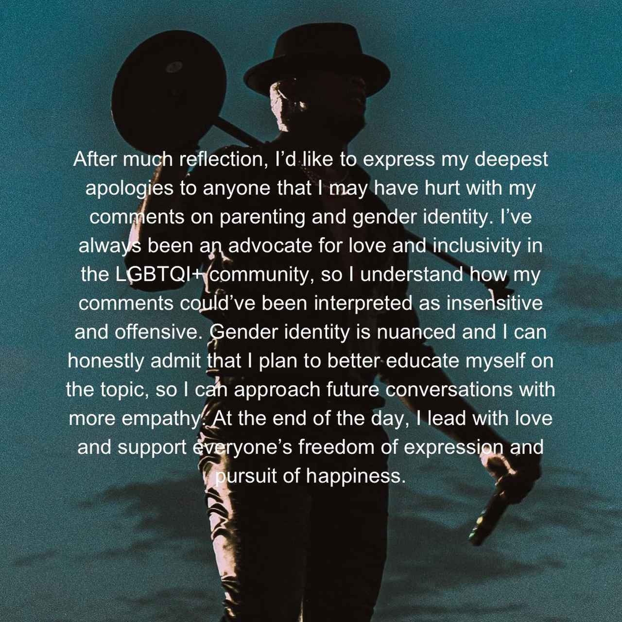 「熟考した結果、子育てとジェンダー・アイデンティティに関する私の発言で傷つけてしまった人がいたら心から謝ります。私は以前から、LGBTQI+コミュニティに対する愛とインクルーシブな考えを訴えてきました。だからこそ、私の発言がいかに無神経で不快なものと解釈されたかは理解しています。