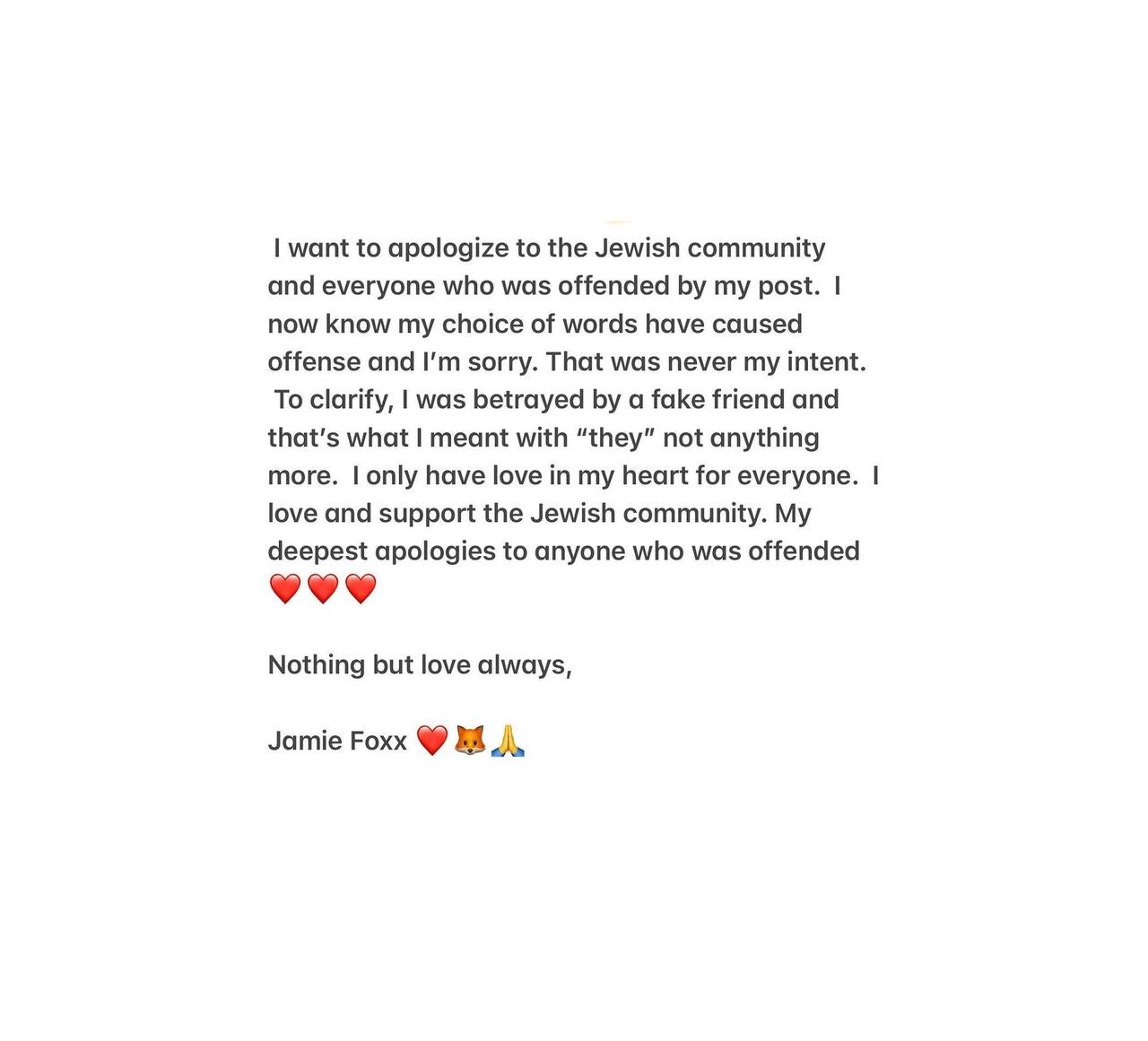 騒動のさなか、自身の投稿が与えた大きな誤解と悪影響に気づいたジェイミーは元の投稿を削除。新たな投稿でこう謝罪した。「ユダヤ人コミュニティと私の投稿で気分を害した全ての人に心から謝罪したいと思います。今になって私の言葉の選択ミスで多くの人を傷つけてしまった事に気付きました。申し訳ありませんでした。あの投稿は私の本当に言いたかったことではないのです。あの文面に関してはっきりさせておくと、私は最近、偽の友人に裏切られました。その偽の友人の事をあの投稿で『彼ら』と言っただけで、それ以上の意味はありません。私の心の中にあるのは皆さんへの愛だけです。私はユダヤ系コミュニティを愛していますし支持しています。気分を害された方には心から謝罪します」。