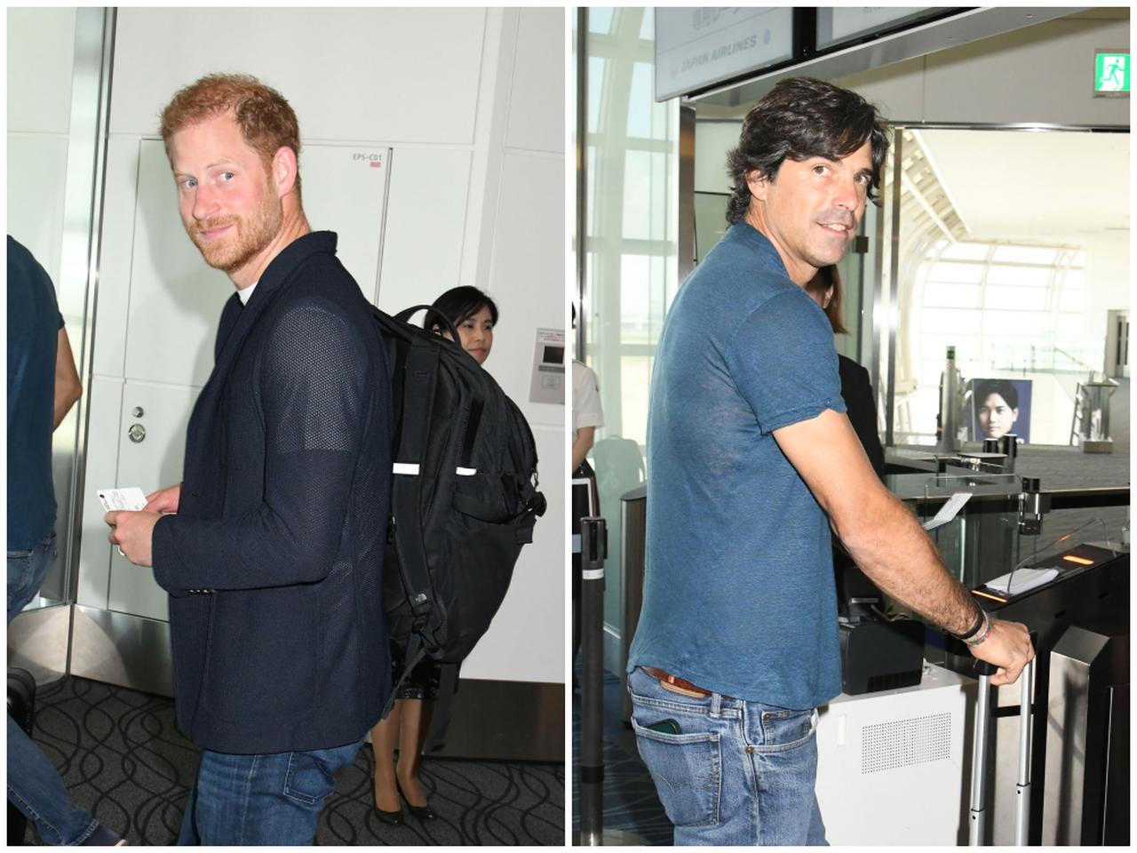 日本時間8月10日、羽田空港から次の目的地であるシンガポールへと旅立ったヘンリー王子(左)と友人でポロ選手のナチョ・フィゲラス氏(右)。