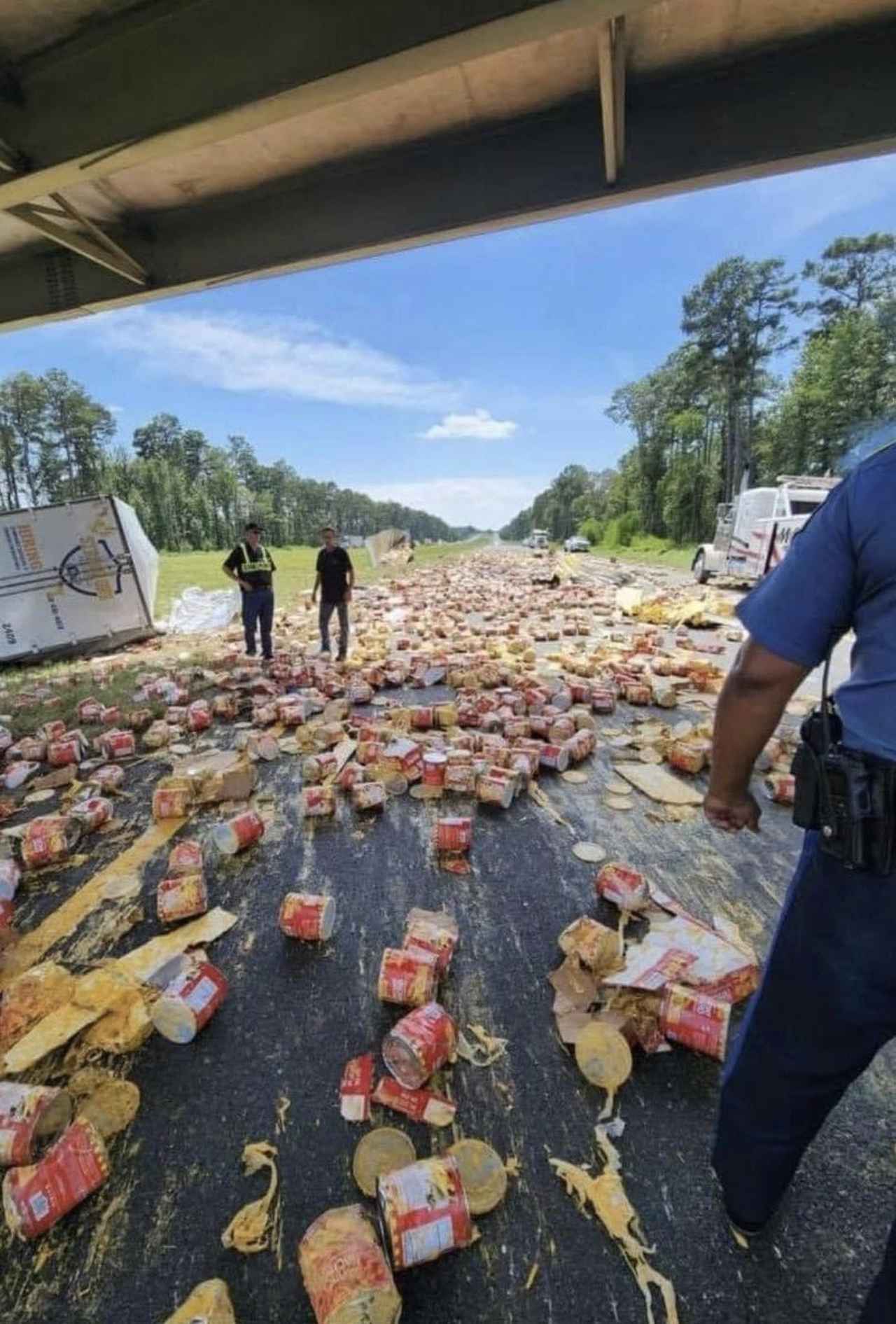 「ナチョ・チーズの缶詰を積んだトラックが荷物を散乱させました」