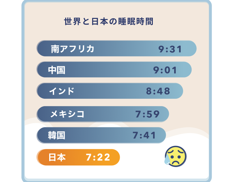 開発の背景にあったのが日本人の睡眠時間の短さ。日本人の睡眠時間は世界の先進国の中でも短いことが報告されており、Pillowの調査でも日々のストレスや生活環境の変化等の理由から「寝つきが悪い」や「寝ても疲れがとれない」といった睡眠に関する何かしらの悩みを抱えている人が多いことが分かった。