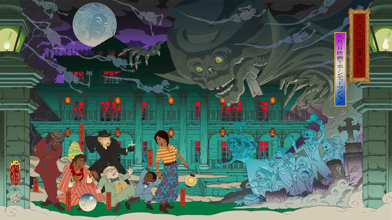 そんな塩崎氏によって描かれた今回の特別ビジュアル【九九九幽霊夜行(きゅうひゃくきゅうじゅうきゅうゆうれいやこう)】は、999人のゴーストたちが住む館“ホーンテッドマンション”の世界観を、妖怪なども度々描かれてきた浮世絵のタッチで表現された一作。今にもゴーストたちのうめき声が聞こえてくるようなこのビジュアルでは、夜な夜な鬼や妖怪が徘徊する「百鬼夜行」をモチーフとした、生々しくも、どこか可笑しさも漂うゴーストたちの姿。さらに、江戸時代後期「奇想の絵師」とも呼ばれた浮世絵師・歌川国芳の代表作「相馬の古内裏」で知られる、巨大な骸骨を彷彿とさせる、頭上からのぞき込む巨大なハットボックス・ゴーストが目を引くビジュアルとなっており、彼らがこの作品でどんな世界へと誘ってくれるのか期待せずにはいられない。加えて、本作に登場する館の主・ギャビーとその息子トラヴィス、そしてゴーストたちにおびえているようにも見える、クセの強い4人の心霊エキスパートたちのコミカルな様子も捉えられている。