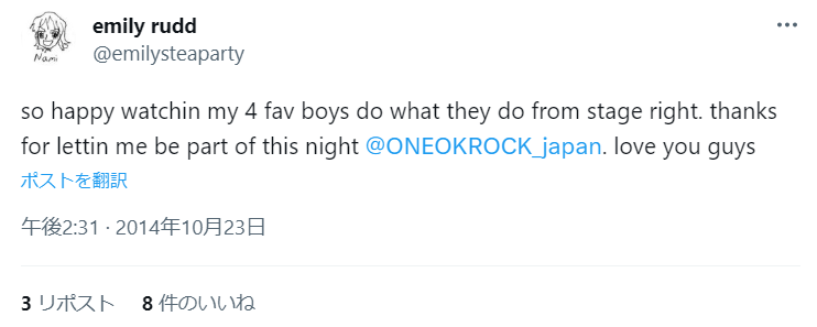 エミリー・ラッドがONE OK ROCKについて投稿した2014年のツイート(X)。©Emily Rudd/Twitter
