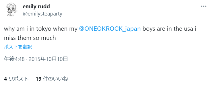 エミリー・ラッドがONE OK ROCKについて投稿した2015年のツイート(X)。©Emily Rudd/Twitter
