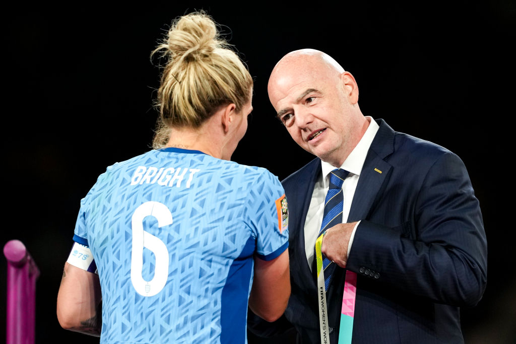 2023 FIFA女子ワールドカップのメダル授与シーンで、FIFAのジャンニ・インファンティーノ会長へのに冷ややかな対応が目立った。(フロントロウ編集部)