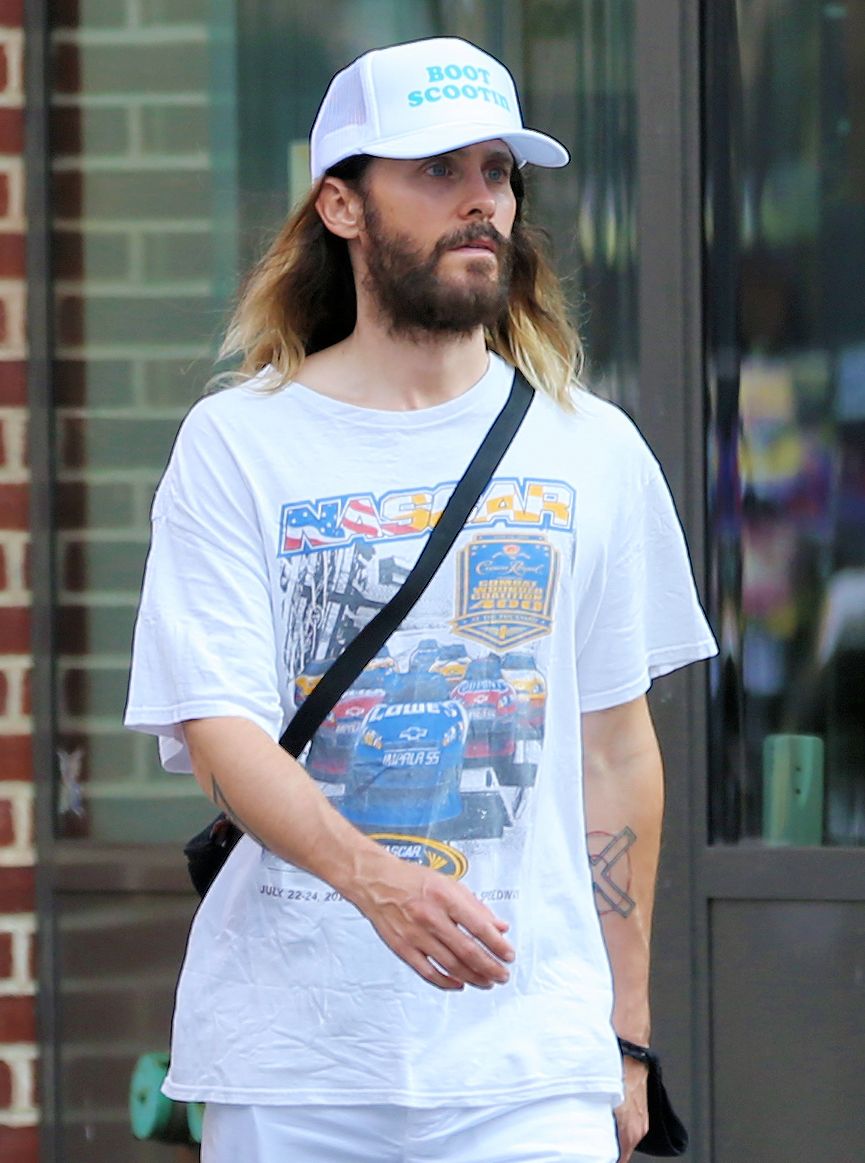 ファッションセンスにも定評があるジャレッドは、カーレースNASCARのヴィンテージ風白Tシャツに白のパンツを合わせ、キャップブランドBottom Shelfの白キャップをチョイス。