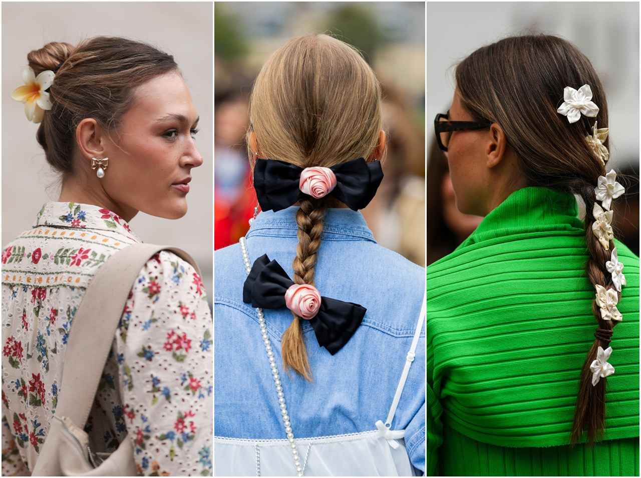 ローズやプルメリアなどのフラワーモチーフのヘアアクセを取り入れたアレンジも、今回ファッショニスタの間で被り率が高かった。三つ編みポニーにお花のアクセをたっぷり散りばめて飾るなど、アクセを複数使いするのもオシャレ。