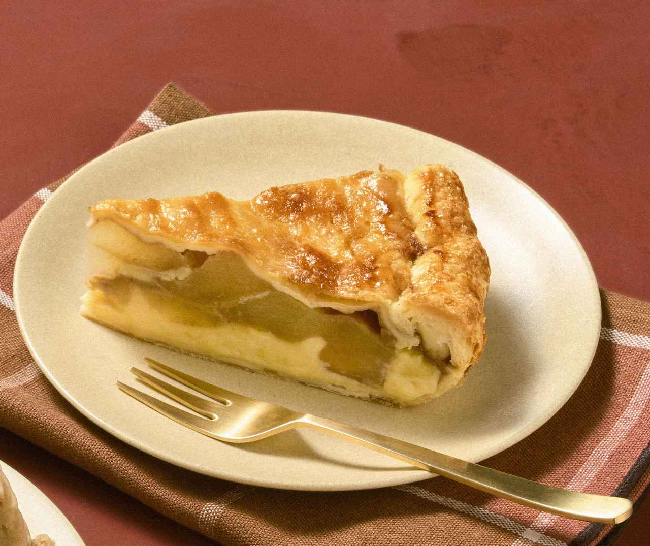シナモンやナツメグなどほのかなスパイスが香る青森県産紅玉りんごを主役に、まろやかな甘みのカスタード、バターとキャラメル風味のフィリング、さくさくのパイ生地を合わせて仕上げた。